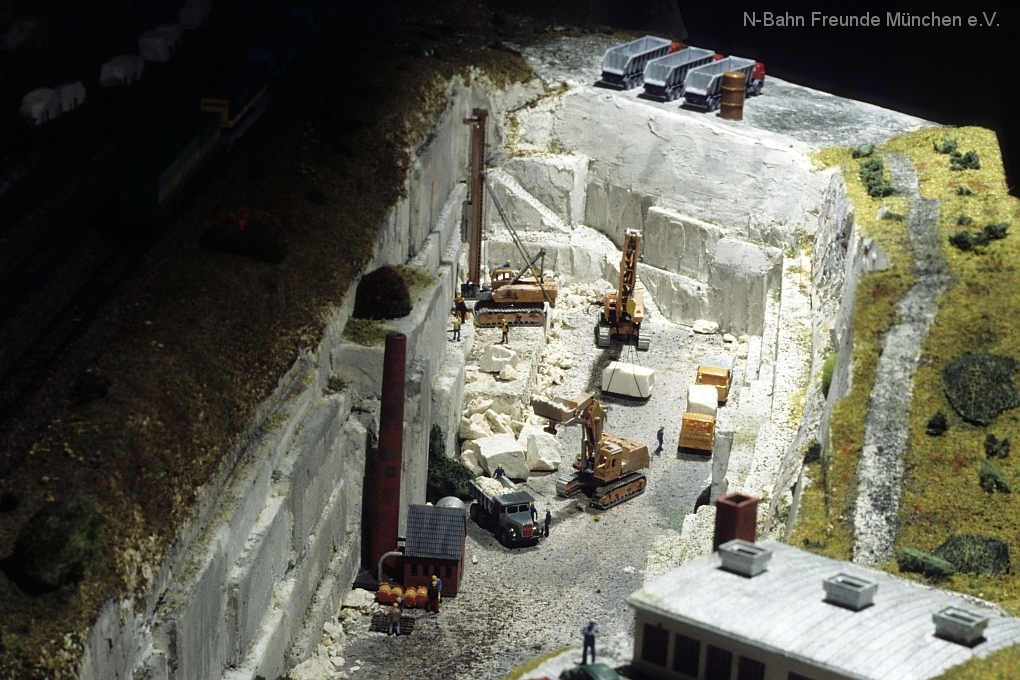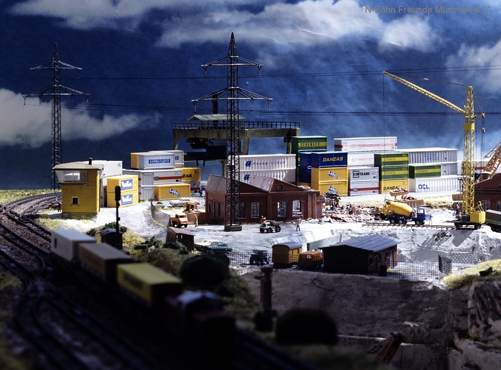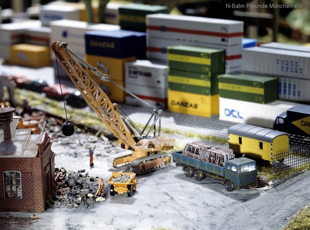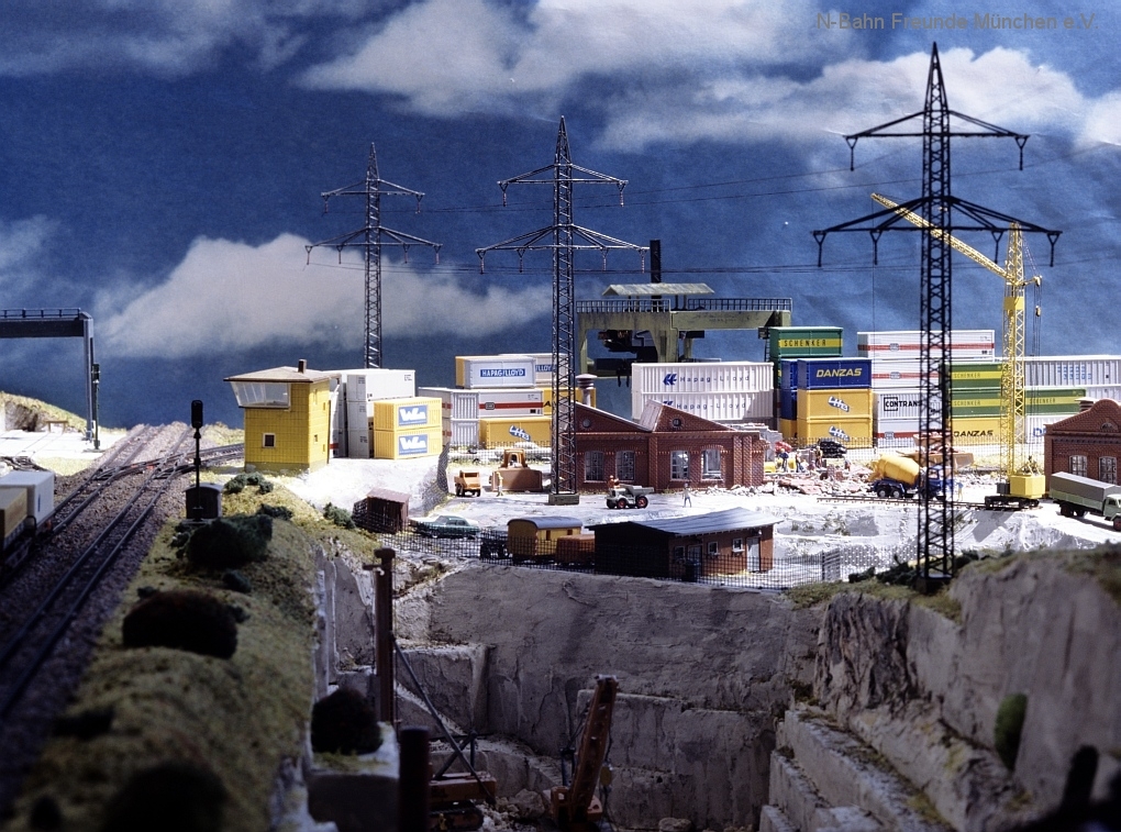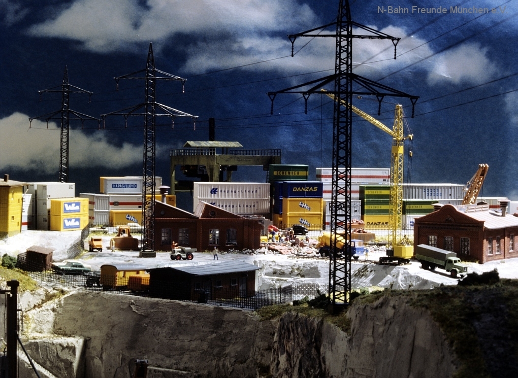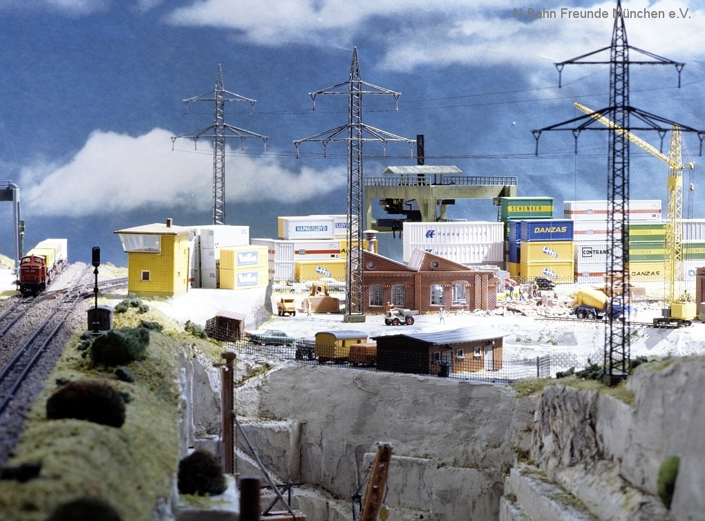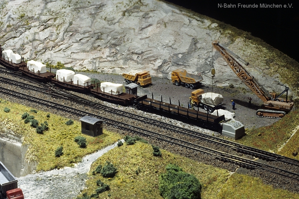 Die Module „Steinbruch“ und „Containerverladung“ sind seit 1992 auf Ausstellungsanlagen der N-Bahn Freunde München im Einsatz.