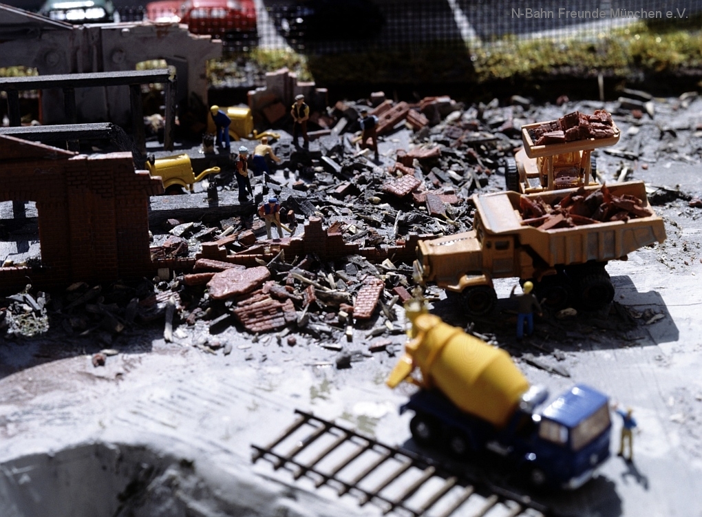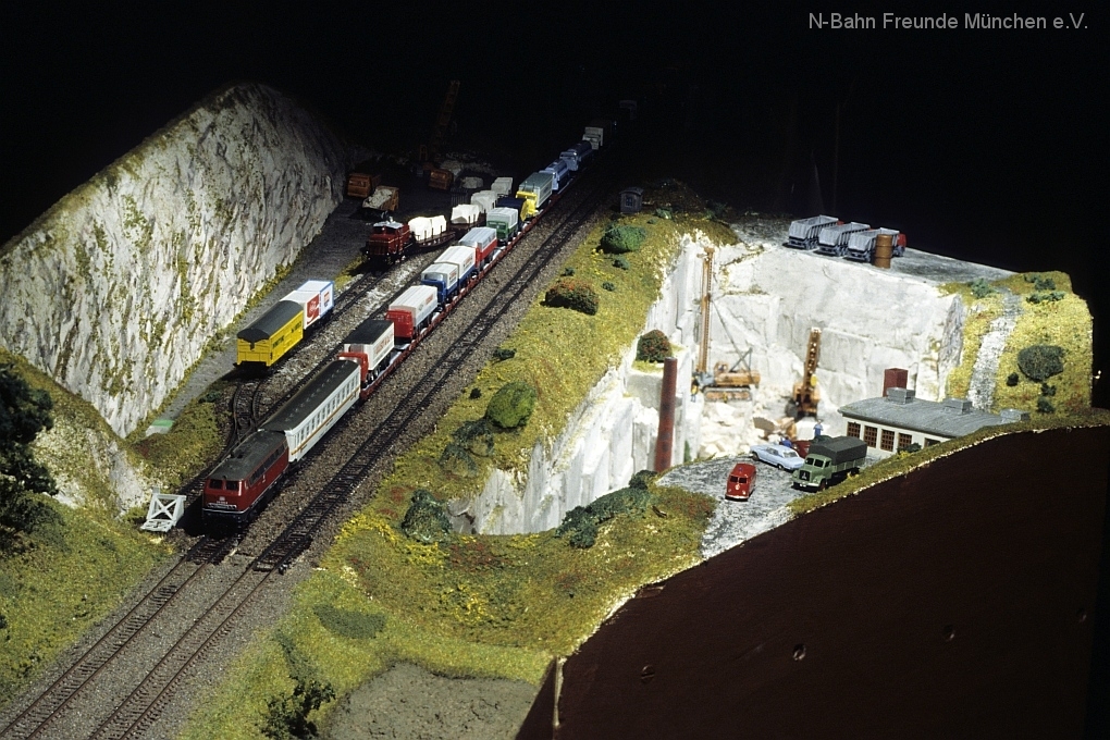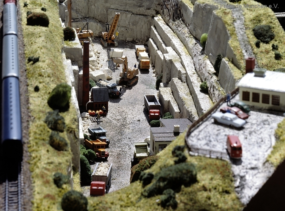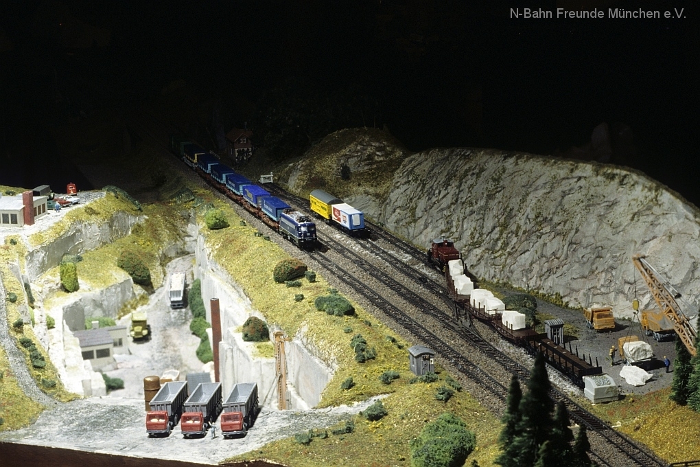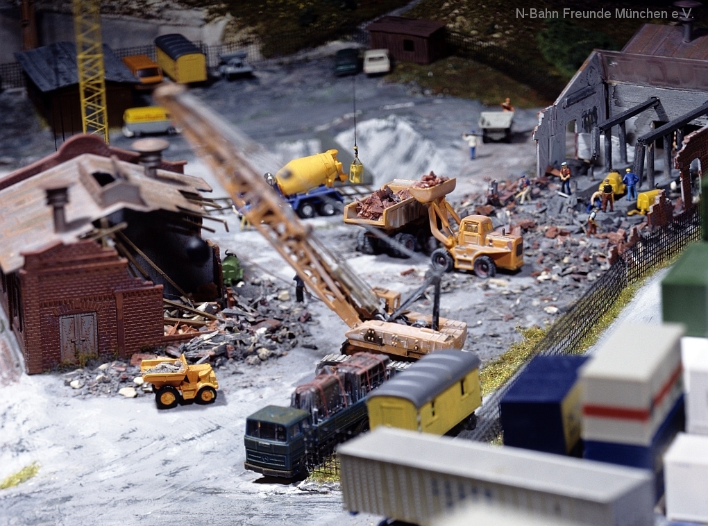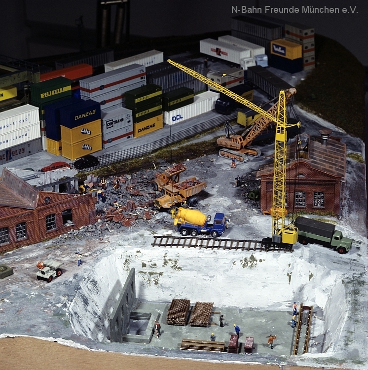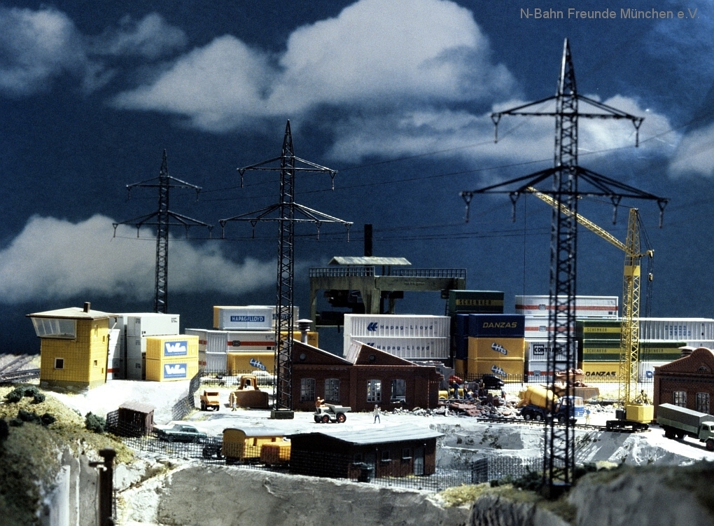 Die Module „Steinbruch“ und „Containerverladung“ sind seit 1992 auf Ausstellungsanlagen der N-Bahn Freunde München im Einsatz.